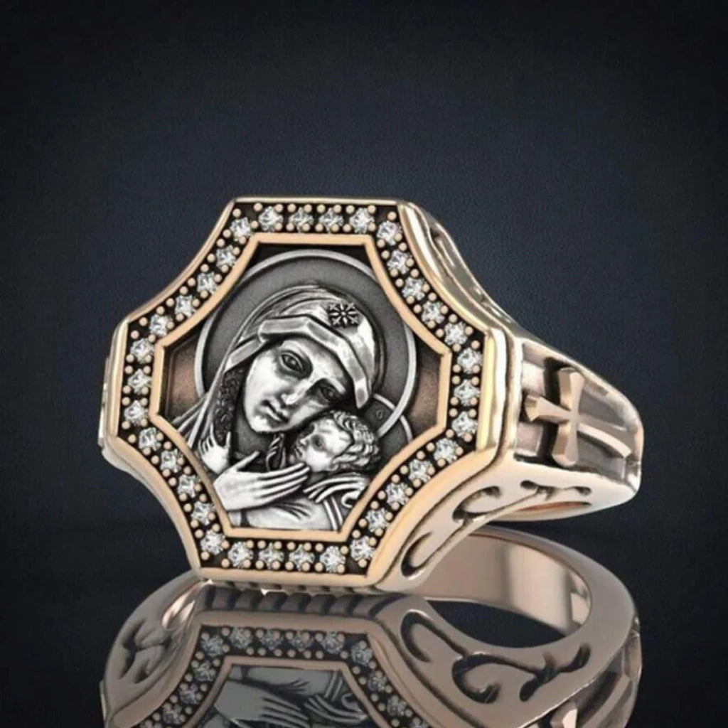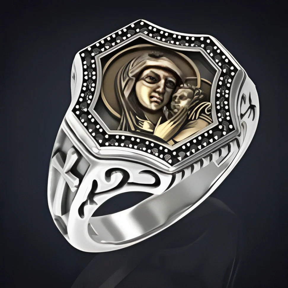 O Anel Sagrado Amor de Maria e Jesus é uma joia que une duas das figuras mais reverenciadas da fé cristã: Maria, a Mãe de Deus, e Jesus Cristo, o Salvador. Este anel, que combina prata e ouro de altíssima qualidade, é uma representação sublime do amor sagrado entre Mãe e Filho, sendo um símbolo de devoção, fé e proteção divina.