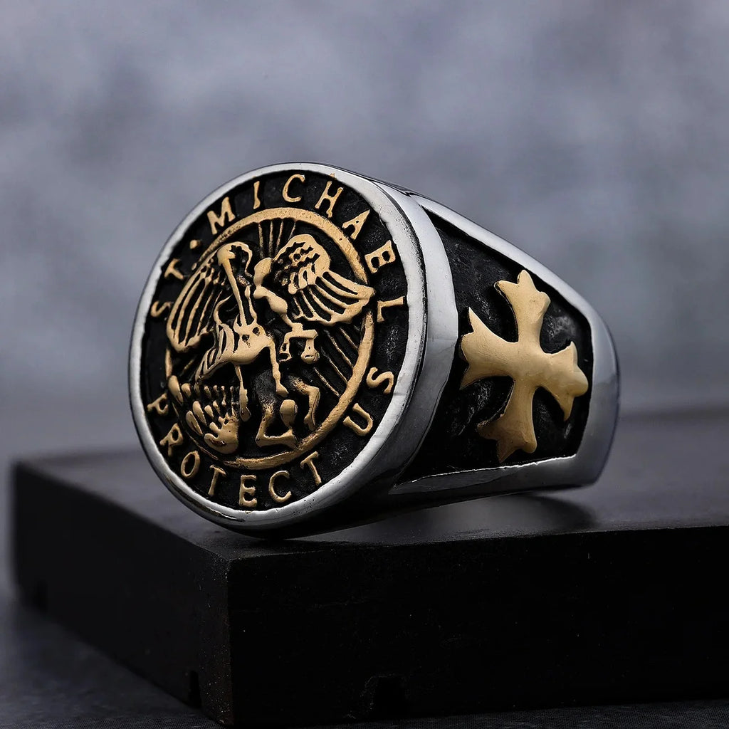 O Anel São Miguel Arcanjo é uma peça robusta e cheia de significado, feita em aço inoxidável escuro, trazendo um visual marcante e imponente. Seu design apresenta a poderosa imagem de São Miguel Arcanjo, simbolizando proteção, força e fé.
